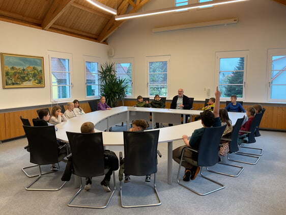 Danach durften wir Herr Schäuffele Fragen über seine Arbeit und sein Leben stellen. Wir haben erfahren, dass seine Lieblingsfarbe früher gelb war und jetzt blau ist. Er trinkt gerne Johannisbeerschorle und hatte früher Hasen und sogar mal ein Schaf als Haustiere. Unser Bürgermeister ist schon seit 20 Jahren im Amt und seine liebste Aufgabe ist es, Trauungen durchzuführen. Tatsächlich hat er auch ein paar unserer Eltern getraut. :)