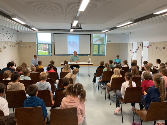 Vergangene Woche durften die Kinder der Klassenstufen 3 und 4 an einem besonderen Event teilnehmen. Der Autor Manfred Theisen reiste extra aus Köln an, um aus seinem Buch „Monsterland - Ein Geist auf der Flucht“ vorzulesen. Herr Theisen entführte die Kinder in den mystischen Freizeitpark Monsterland, um dort gemeinsam mit Fanni und ihrem Vater Mark van Helsing auf Geisterjagd zu gehen. Wortgewandt und mit viel Witz erzählte Herr Theisen seine Geschichte. Ein besonderes Highlight war, dass auch die Kinder sowie die Lehrkräfte in Rollen schlüpfen und aktiv an der Autorenlesung teilnehmen konnten.